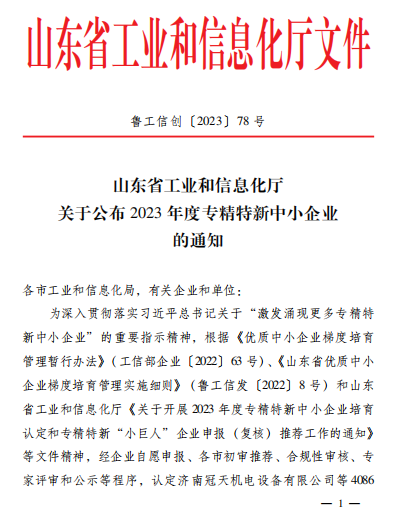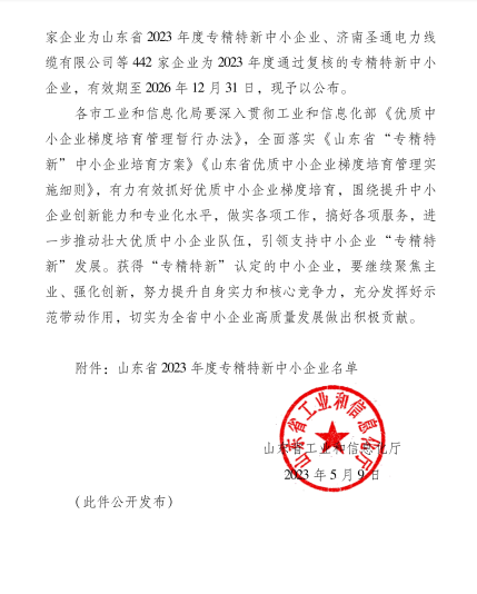 2023年5月9日,山東省工業(yè)和信息化廳公布了《關于2023山東省“專精特新”中小企業(yè)名單的通知》,經(jīng)企業(yè)申報、市區(qū)審核推薦、專家評審等程序,淄博奧固特科技有限公司憑借優(yōu)越的綜合管理策略和高效創(chuàng)新能力,成功獲評山東省“專精特新”中小企業(yè)稱號。